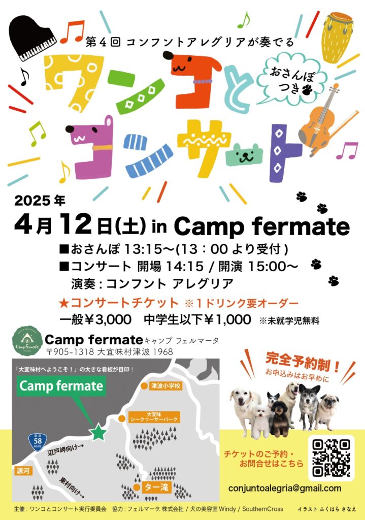 県内で活躍するバイオリン、ピアノ、パーカッションのインストバンド「コンフント・アレグリア」による、愛犬と一緒に聴ける野外コンサート。コンサートの前に参加者みなさんでで会場付近でのお散歩をした後に、コンサート会場となるキャンプ場の芝生で、ワンコも一緒にコンサートを楽しみます。キャンプ場に併設するカフェでドリンクや軽食もあり。良質なワンコのおやつ、グッズ、ドッグソープの販売もあります。