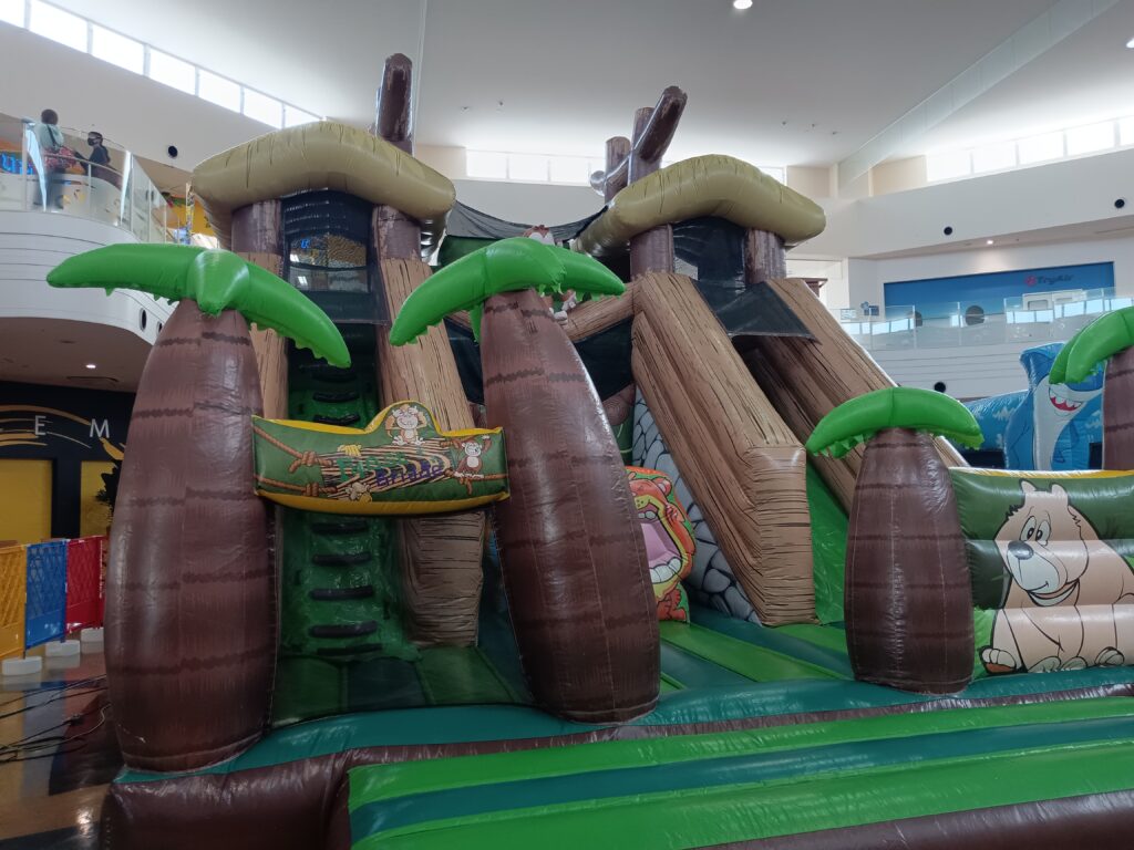 空気で膨らますふわふわ遊具「モンキースライダー」「オーシャンスライダー」「ディサウルスバウンサー」「ストーンエイジ・ボールプール」の4遊具。