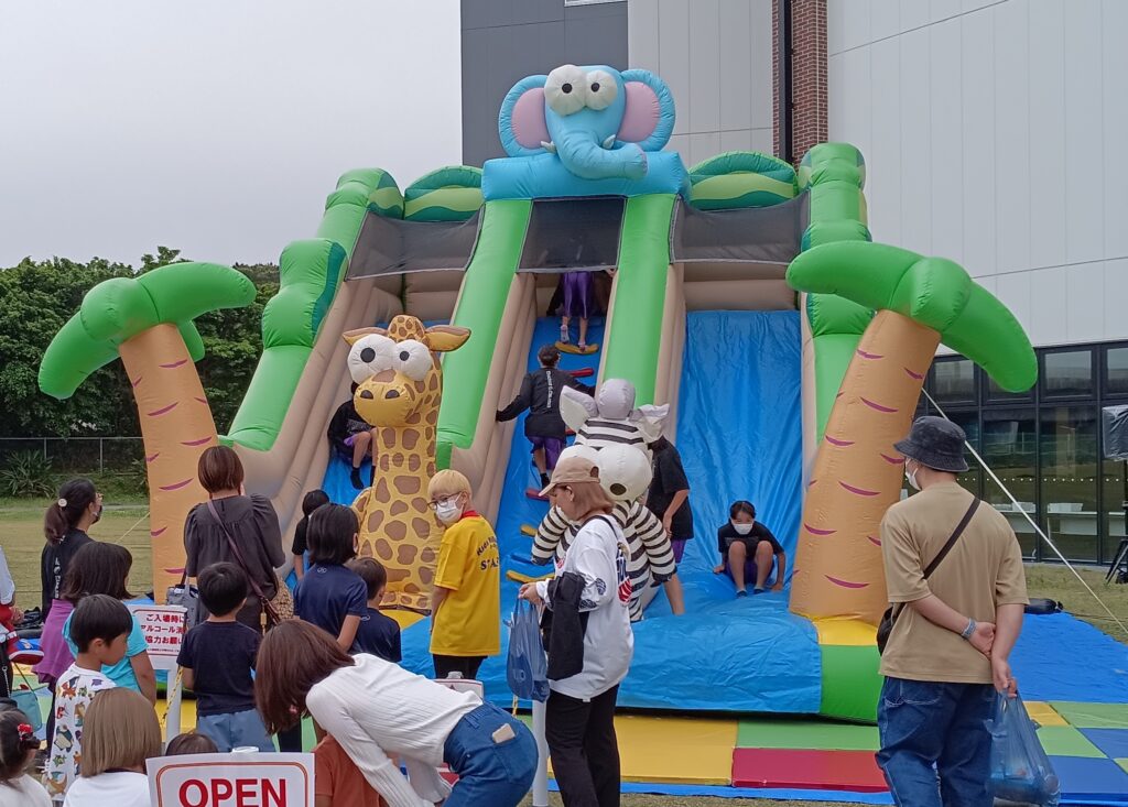 空気で膨らますふわふわ遊具「サファリスライダー」「ワンダーランド」「アリゲーター」「キリンハウス」の4つの遊具をそろえています。