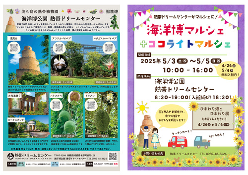 『海洋博マルシェ+ココライトマルシェ』、GW/10月/1月のイベントとして、年に3回開催しております♪癒し部門と手作り部門、趣味を活かし専門分野で活躍されている方々の出展・お披露目の場として♪たこ焼き・カレー・スイーツ系などのキッチンカーも集います♡他にも、洋蘭や植物販売の軽トラ市も開催中♪老若男女どなたでも楽しめるイベントなので、是非、ご家族揃ってドライブがてら、海洋博公園内の熱帯ドリームセンターへ、植物園で癒されつつ、マルシェをお楽しみにお越しくださいませ♪