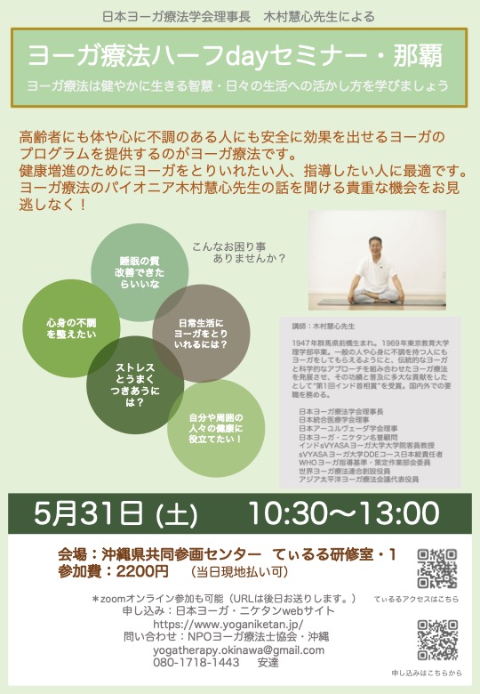 ヨーガ療法ハーフdayセミナー・那覇 t-tamaki 7か月前 健康増進のためにヨガをとりいれたい人、指導したい人に最適です。 ヨーガ療法のパイオニア木村彗心先生の話を聞ける貴重な機会をお見逃しなく!