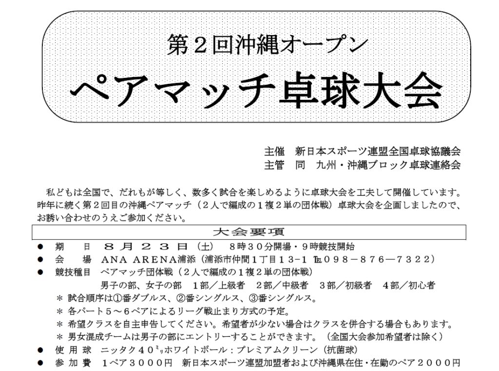 昨年に続く第2回目の沖縄ペアマッチ(2人で編成の1複2単の団体戦)卓球大会を企画しましたので、お誘い合わせのうえご参加ください。