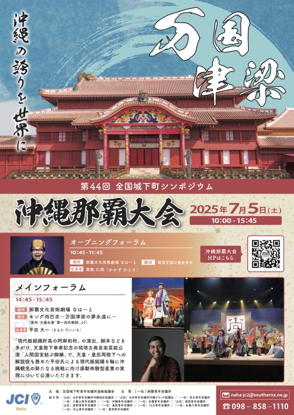 「第44回全国城下町シンポジウム沖縄那覇大会」は、首里城復興への機運を高めるとともに、琉球の先人達が築いてきた栄光の歴史を学び、「うちなーんちゅ」としての誇りを日本全国に、そして世界に向けて発信するための大会とします。