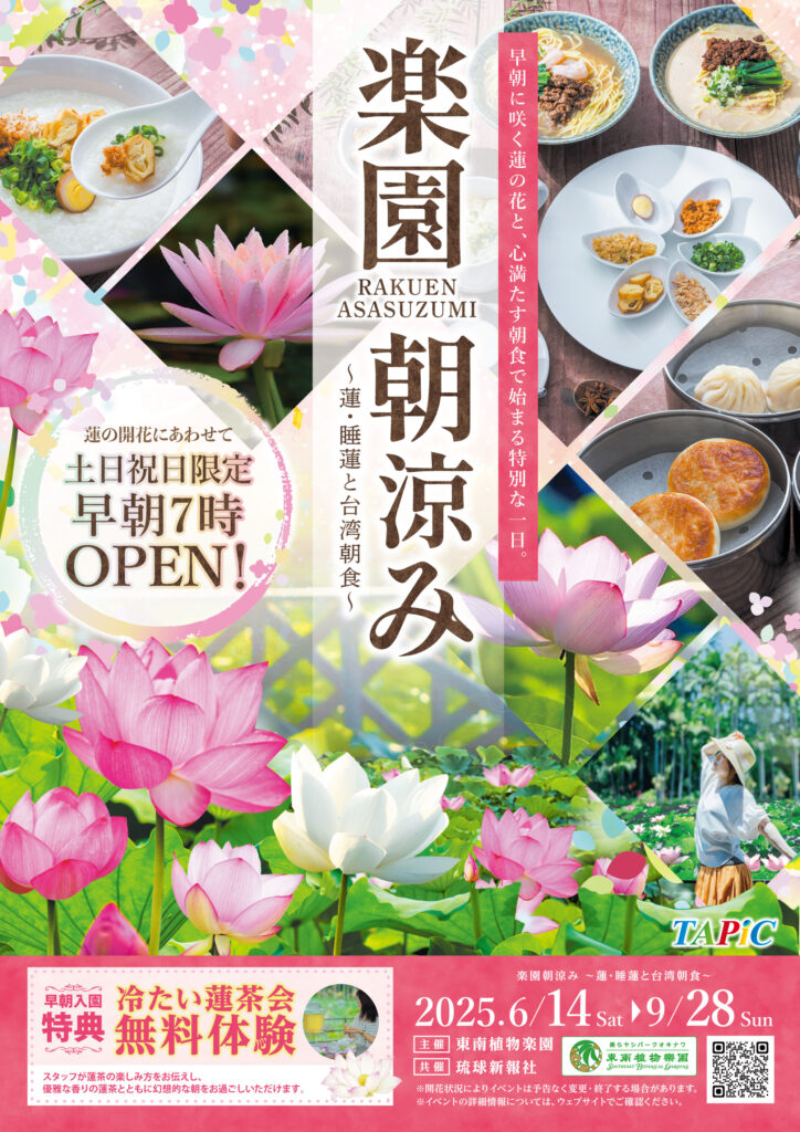夏の朝、風にあたりながら涼を楽しむ「楽園朝涼み」イベントでは、水辺に咲く蓮や睡蓮を眺めながら爽やかな園内を散策でき、ここでしか味わえない「楽園台湾粥」などの朝食メニューを堪能いただけます。