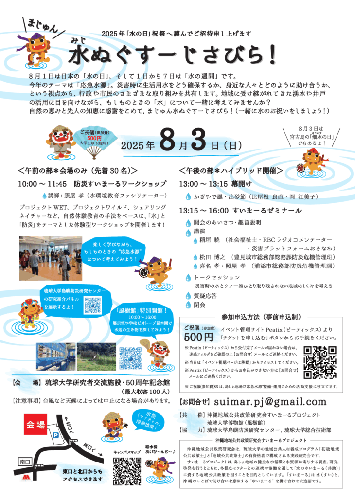 「水ぬぐすーじさびら!2025」は、日本「水の日」(8月1日)および「水の週間」(8月1日~7日)にあわせて開催する啓発イベントです。本年は「応急水源」をテーマに、災害時の生活用水確保という視点から、地域に根ざした湧水や井戸の役割を見つめ直し、持続可能な水利用と防災のあり方について考える機会とします。