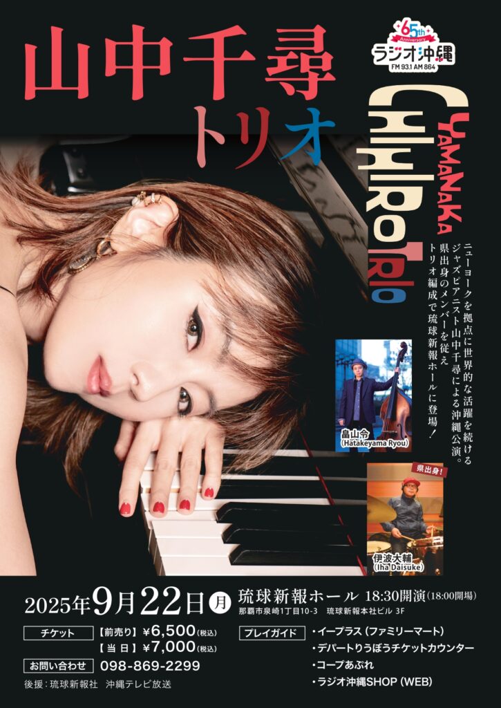山中千尋トリオコンサート t-tamaki 3か月前 ニューヨークを拠点に世界的な活躍を続けるジャズピアニスト山中千尋による沖縄公演。 県出身のメンバーを従え、トリオ編成で琉球新報ホールに登場! チケット前売 ¥6,500(税込) 18:00開場 18:30開演