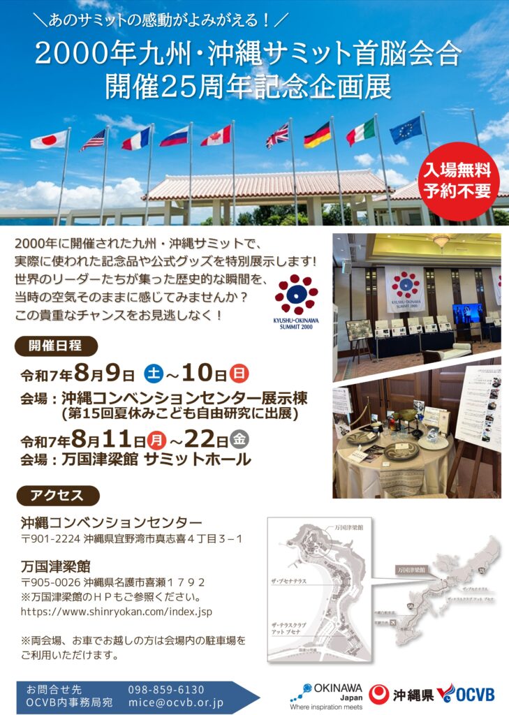 沖縄県および一般財団法人沖縄観光コンベンションビューロー(以下OCVB)は、2000年九州・沖縄サミット首脳会合開催から25周年を記念し、このたび「2000年九州・沖縄サミット首脳会合開催25周年記念企画展」を開催する運びとなりました。