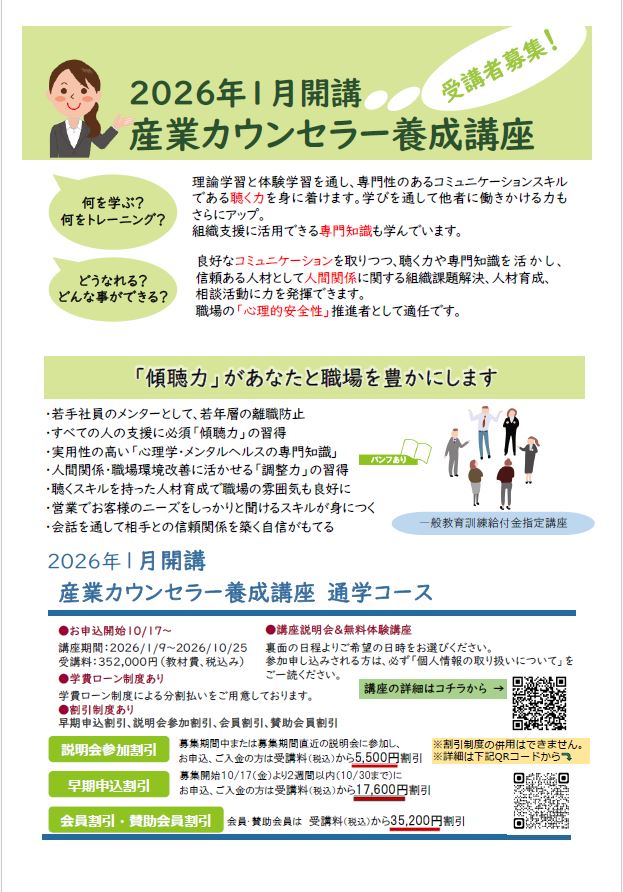 産業カウンセラー養成講座 無料体験講座 t-tamaki 3か月前 1月から開講する産業カウンセラー養成講座の説明&無料体験講座のご案内。 傾聴のスキルを身につけるため、より実践的な面接の体験学習を10か月(104時間)かけて学ぶ講座です。 どなたでも参加可能です。 参加ご希望の方は必ず事前予約をお願いします。