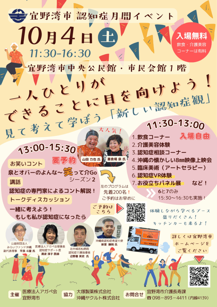 喜舎場泉と山田力也による「泉とオバーのよんな~笑って介Goシーズン2」や沖縄県認知症希望大使を中心としたトークディスカッションの他、認知症VR体験、臨床美術(アートセラピー)、沖縄の懐かしい8mm映像上映会、介護美容体験、飲食コーナーなど、体験型の多彩なプログラムを行う。