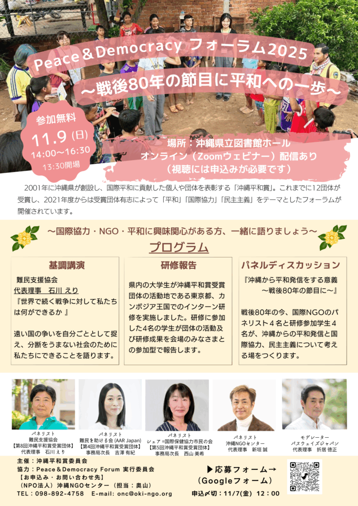 2001年に沖縄県が創設し、国際平和に貢献した個人や団体を表彰する「沖縄平和賞」。これまでに12団体が受賞し、2021年度からは受賞団体有志によって「平和」「国際協力」「民主主義」をテーマとしたフォーラムが開催されています。今年度は、基調講演、県内の大学生が沖縄平和賞受賞団体の活動地である東京都、カンボジア王国でのインターン研修を実施した研修内容の報告、国際NGOパネリストとのパネルディスカッションを行います!