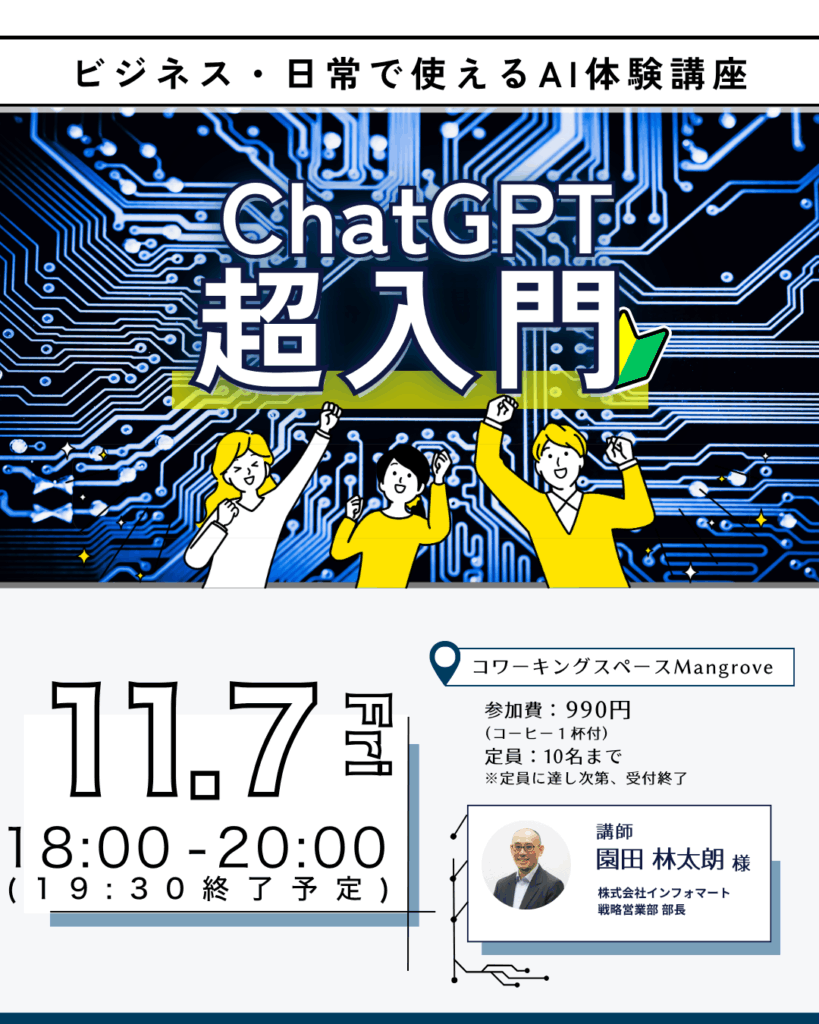 ChatGPT講座【11月7日(金)】ChatGPT超入門!ビジネス・日常で使えるAI体験講座 in コワーキングスペースMangrove
