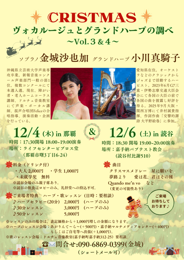 12月2日間、下記日程で歌とグランドハープのクリスマスコンサートをします🎄✨
