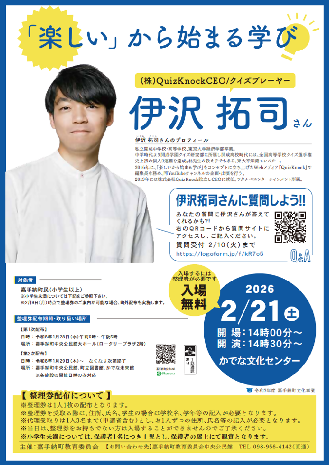 TVでおなじみ!クイズ王の伊沢拓司氏を講師にお迎えし、「『楽しい』から始まる学び」と題し、講演会を開催します。