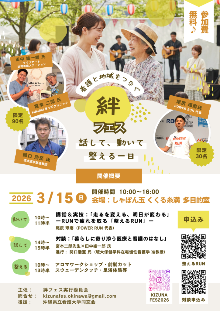 このたび、沖縄県看護大学2期生OB有志を中心に、地域住民と世代を超えてつながる健康イベント「絆フェス in くくる糸満」 を開催する運びとなりました。本イベントは、体操・音楽・健康体験・対談を通して、“人と人が承認し合い、笑顔が循環する地域づくり”を目的としております。午前中は、メンタル不調を乗り越え「整えるRUNプログラム」を考案された尾尻琢磨氏による講話および実技を実施いたします。運動が苦手な方や高齢者も参加できる内容で、心と体を整える新しい健康アプローチをご提案いたします。午後は「暮らしに寄り添う医療と看護の話」と題し、地域に根ざした医療・看護の在り方について対談を行います。