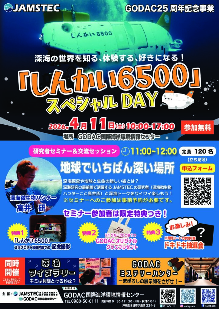 名護市にある国際海洋環境情報センター(GODAC)では、未知なる深海の世界を学び・体感できる特別イベントを開催します。