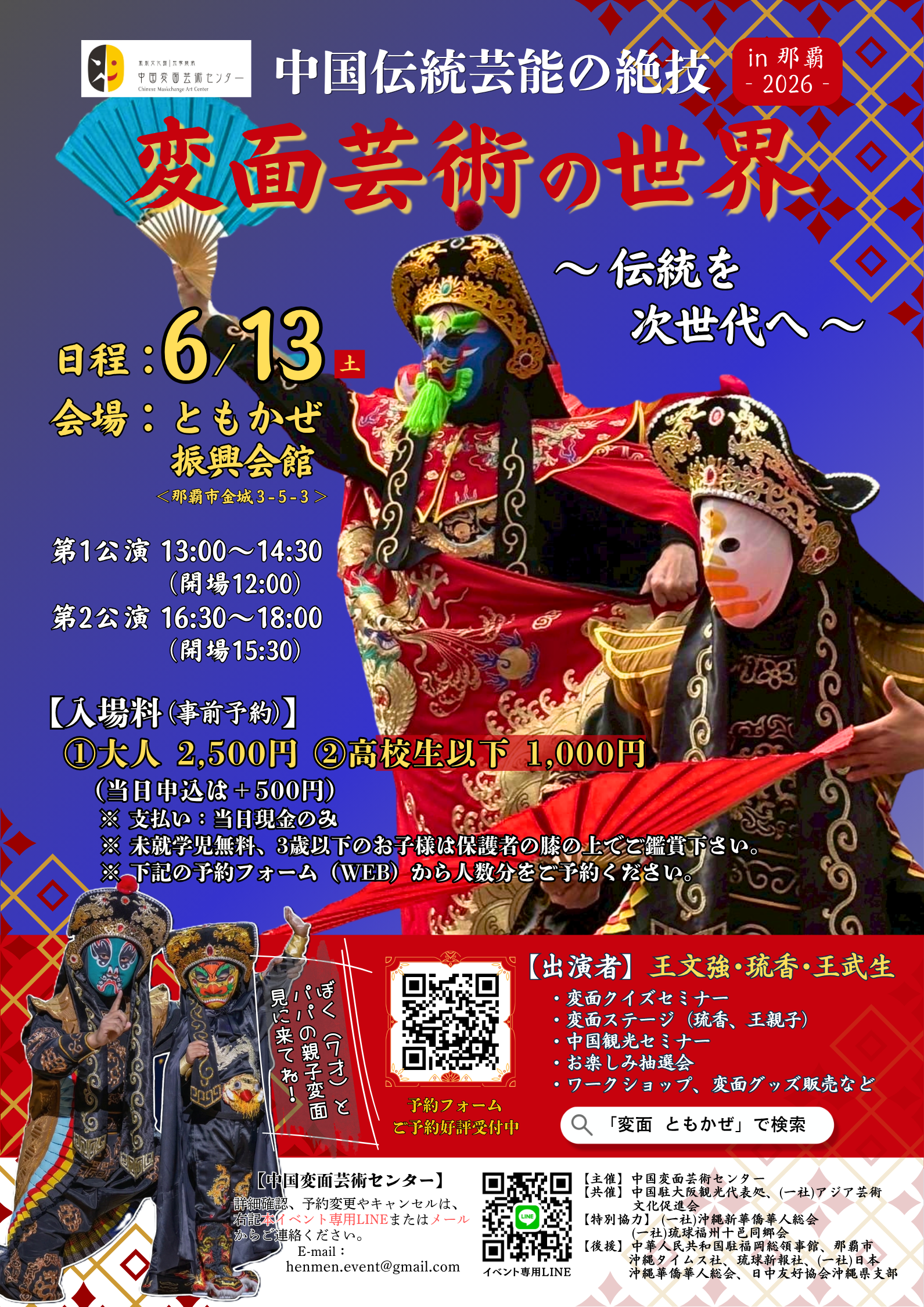 古来より中国と文化的・歴史的に深い繋がりがある沖縄において、中国伝統芸能「変面」の魅力を紹介し、セミナーやステージを通じて文化交流や異文化理解を深めます。また、中国の観光要素の魅力を紹介し、両国間の実質的な往来・交流の促進も目指します。