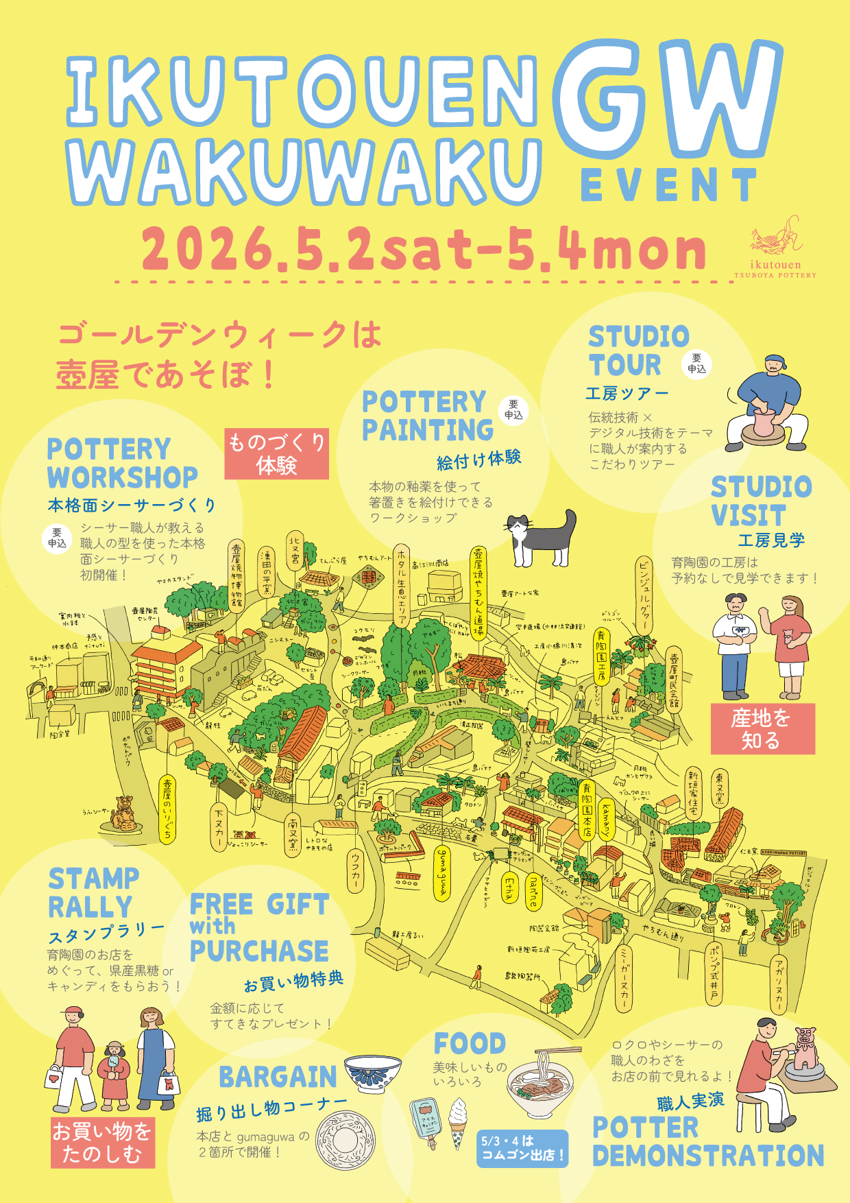 育陶園には、本店・gumaguwa・Kamany・Etha・nan*ne、壺屋のいりぐちの6店舗と、陶芸体験のやちむん道場、そしてものづくりの現場である工房があります。それぞれの場所をめぐりながら、器と出会い、手しごとにふれ、壺屋のまちをゆっくり楽しんでいただけるイベントです。